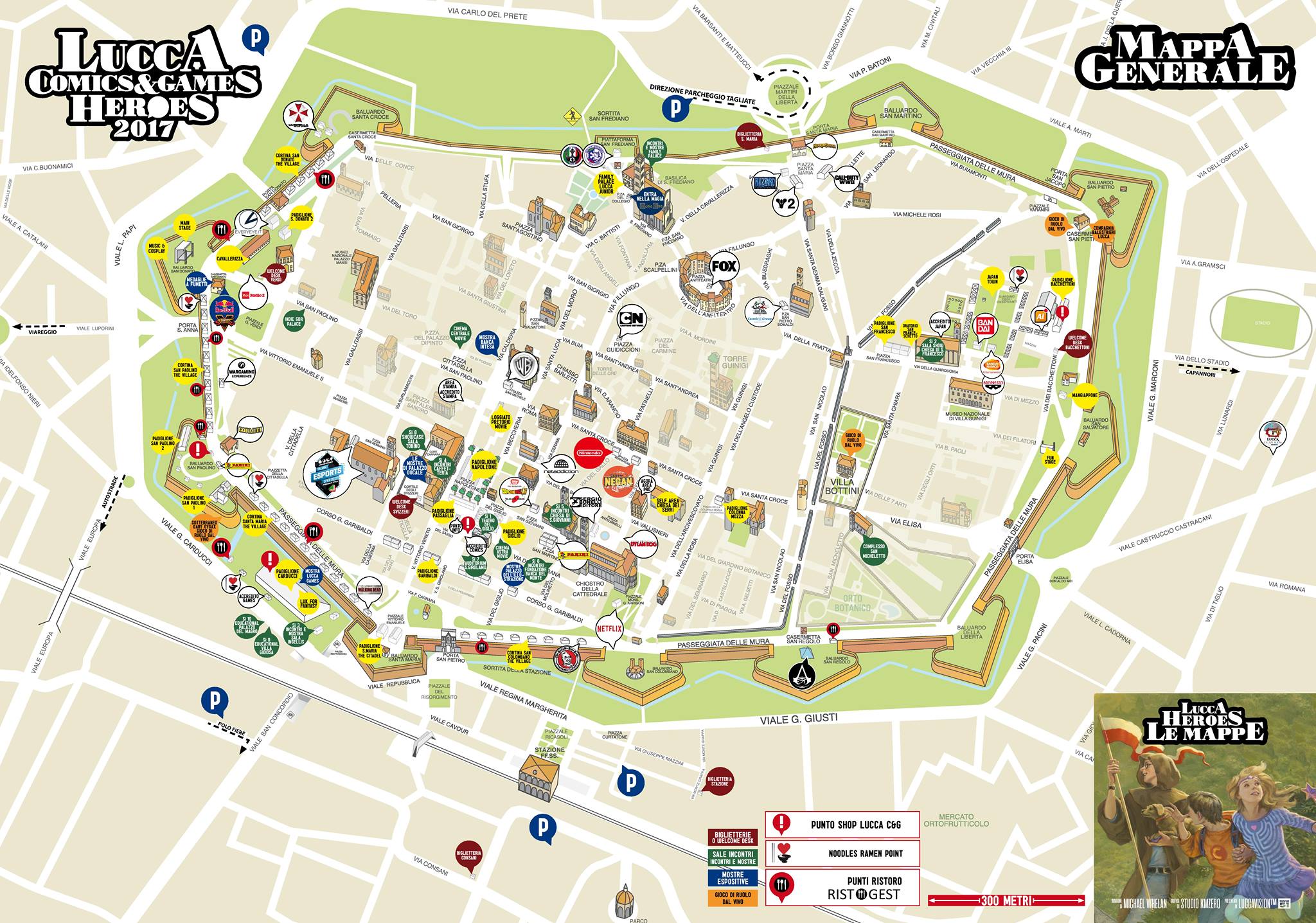 COME – La manifestazione si snoda all’interno, sopra e nelle aree adiacenti le mura di Lucca (centro storico della città), con i diversi padiglioni ubicati nelle varie piazze, prati e sulle mura stesse. Tutti i padiglioni sono raggruppati tematicamente (non sono mischiati) quindi si vengono a creare un’area comics, un’area games, etc… di diverse grandezze a seconda del numero di strutture destinate.